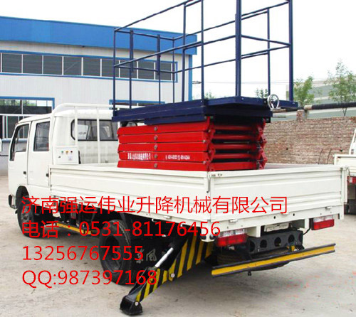 產(chǎn)品規(guī)格:本類產(chǎn)品根據(jù)升降高度可分為4、6、8、10米升降平臺(tái),設(shè)備載重300公斤至500公斤,客戶可根據(jù)需求選用解放、東風(fēng)、輕騎、福田、電瓶車等任何車型,設(shè)備直接采用汽車或電瓶的直接動(dòng)力升降。