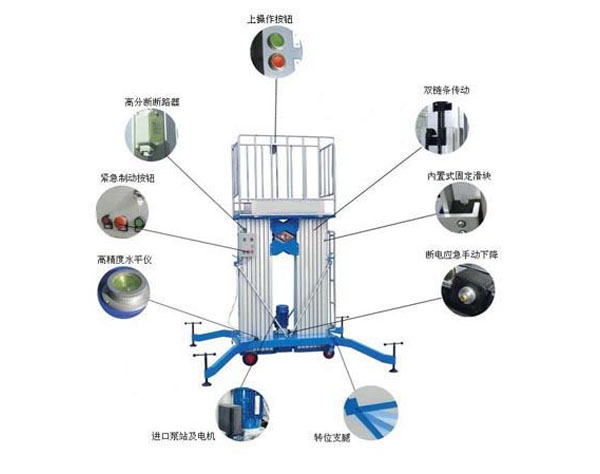 雙柱鋁合金升降機(jī):升降動力分為220V、 380V,或電瓶動力源,特殊環(huán)境也可采用防爆泵站及防爆電器。升高4——10米,載重100-150公斤。主體采用高強(qiáng)度優(yōu)質(zhì)鋁合金材料,具有造型美觀、體積小、重量輕、升降平穩(wěn)、安全可靠等優(yōu)點。廣泛用于工廠、賓館、餐廳、車站、影劇院、展覽館等場所,是保養(yǎng)機(jī)具、油漆裝修、調(diào)換燈具、電器、清潔保養(yǎng)等用途的最佳安全伴侶。
